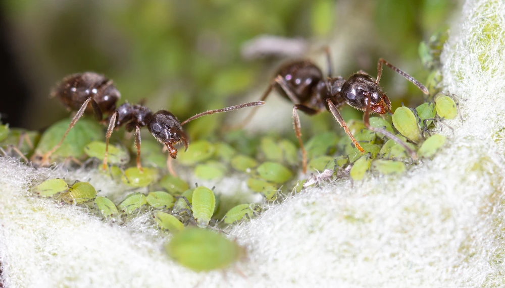 - Ants + Aphids: Ants “farm” aphids for honeydew, protecting them on landscape plants. Outdoor populations can spill toward foundations and entry points.
